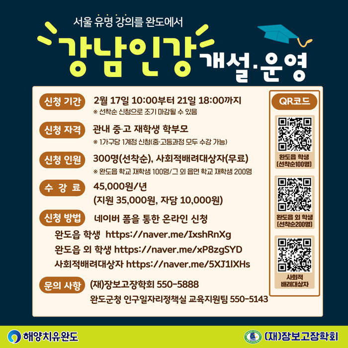 [전남=프레스뉴스]박정호 기자= 완도군과 (재)장보고장학회에서는 지역 중·고교 학생들이 만 원에 서울 강남구 인터넷 강의(이하 ‘강남 인강’)를 무제한 수강할 수 있도록 수강료를 지원한다.