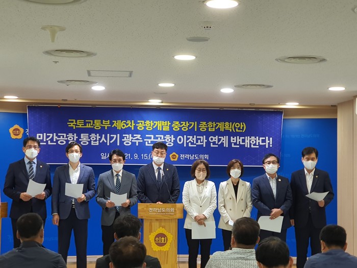 [전남=프레스뉴스] 강래성 기자= 전라남도의회는 15일, 도의회 브리핑실에서 기자회견을 갖고 민간공항 통합시기를 광주 군공항과 연계하는 국토교통부 제6차 공항개발 중장기 종합계획안을 반대하는 성명서를 발표했다.