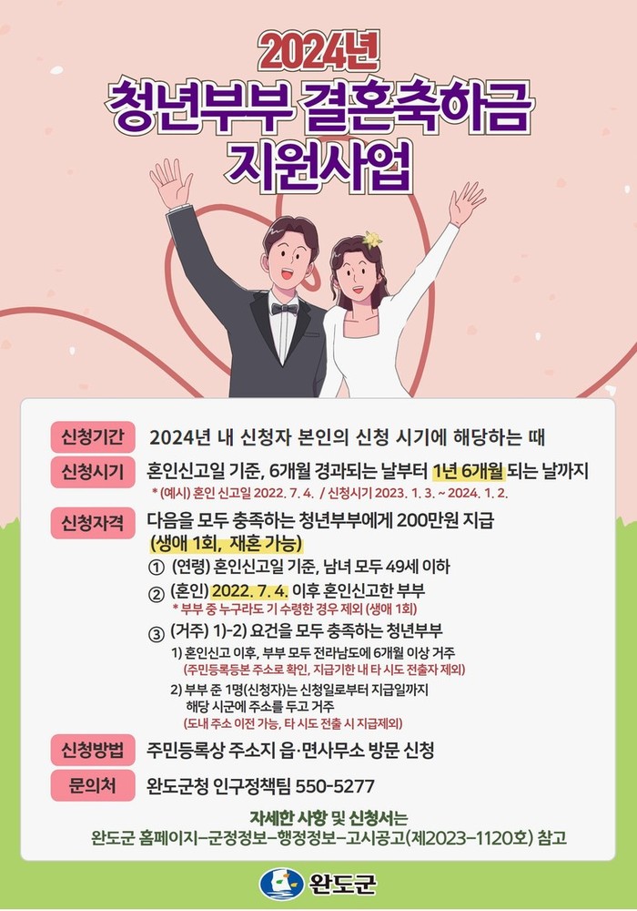 거주 요건은 ▲혼인신고 이후, 부부 모두 전라남도 6개월 이상 거주(지급 기한 내 타 시도 전출자 제외) ▲부부 중 1명 이상은 완도군에 주소를 둔 청년 부부이다.