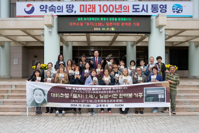일본어 완역본『토지』를 출간한 쿠온출판사는 일본 도쿄에 소재한 한국문학 전문 출판사로 지난 19일 산양읍 박경리 묘소에서 헌정식을 가지고 미수동 통영거북선호텔에서 출판기념회를 열어 완역에 참여한 번역가와 편집자 및 일본독자들과 함께 기쁨을 나눴다. 아울러 21일에는 통영시청에 직접 방문해 일본어 완역본『토지』전권 1묶음을 기증했다.