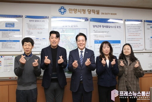▲지난 28일 최대호 안양시장이 당직실을 방문, 당직 공무원들과 기년촬영을 하고 있다. (사진= 안양시) |