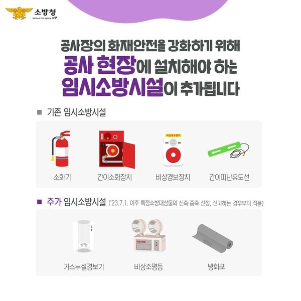 지난해 12월 소방시설 설치 및 관리에 관한 법률이 개정됨에 따라 공사현장의 화재안전관리 강화를 위해 임시소방시설 설치 기준이 강화됐다.