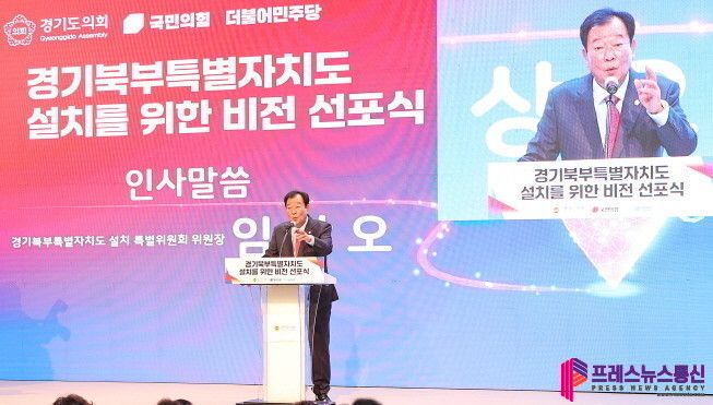[프레스뉴스] 김대일 기자= 경기도의회 경기북부특별자치도 설치 특별위원회 임상오(국민의힘, 동두천2) 특별위원장이 지난 8일 경기도의회 주관 ‘경기북부특별자치도 설치를 위한 비전선포식’에서 메가시티 서울을 뛰어넘는 경기북부의 합심을 호소했다.