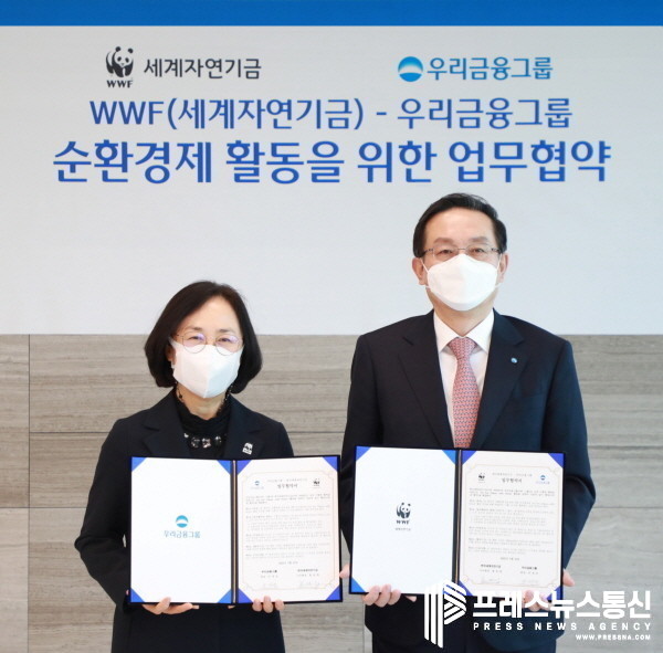 [프레스뉴스] 김대일 기자= 우리금융그룹(회장 손태승)은 서울 중구 회현동 우리금융그룹 본사에서 손태승 회장과 한국세계자연기금(WWF) 홍윤희 사무총장이 참석한 가운데 플라스틱 오염 방지 및 순환경제(Circular Economy) 사회로의 전환을 실천하기 위한 업무협약을 체결했다고 16일 밝혔다.