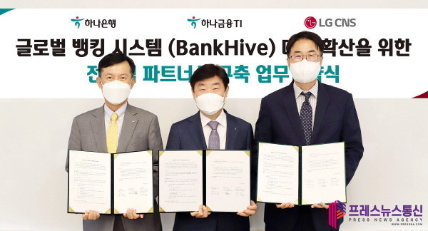 [프레스뉴스] 김대일 기자= 하나금융티아이(대표이사 박근영)는 인천 청라 소재 하나금융그룹 통합데이터센터에서 하나은행(은행장 박성호), LG CNS(대표이사 김영섭)와 함께 글로벌 뱅킹 표준 시스템 ‘뱅크하이브(BankHive)’의 대외 확산을 위한 전략적 업무협약(MOU)을 체결했다고 밝혔다.