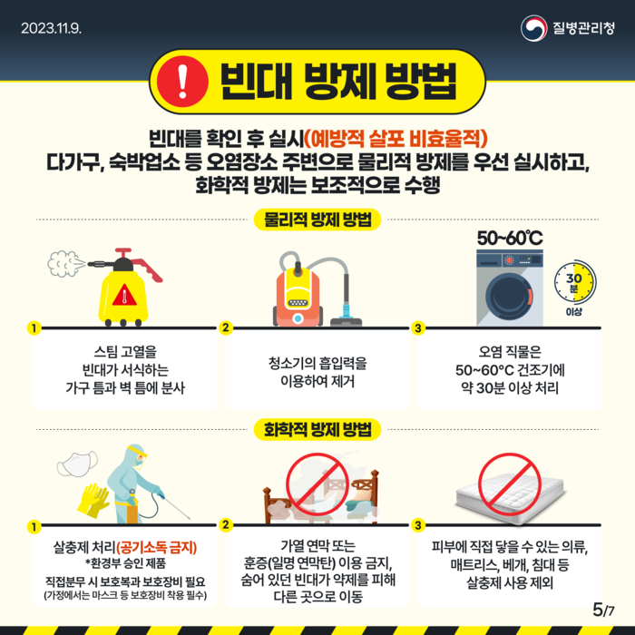 빈대 확산 주요인으로 추정(질병관리청)되는 외국인 근로자 관련 시설에 대하여 전문방제업체를 통해 ▲빈대 조기 발견 모니터링 트랩을 설치, 2주 후 서식 여부를 확인하는 예방적 방제 ▲60℃ 이상의 고온 스팀 분사 등 물리적 방제 ▲필요시 친환경 살충제를 사용한 화학적 방제를 실시하여 조기 발견과 대응에 앞장설 계획이다.