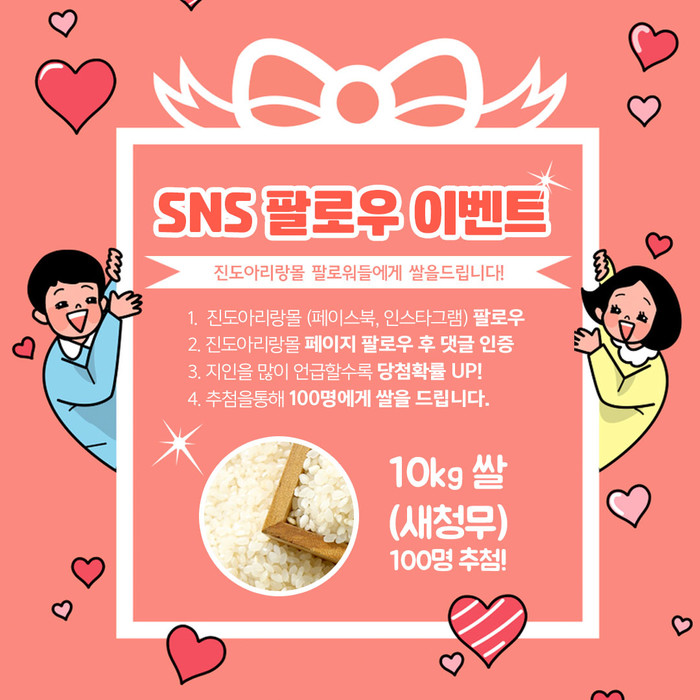 이번 이벤트는 소셜미디어 이용자면, 누구나 인스타그램·페이스북 등 진도아리랑몰 공식 SNS를 찾아 2월 4일(금)까지 팔로우하고 댓글로 인증하면 된다.
