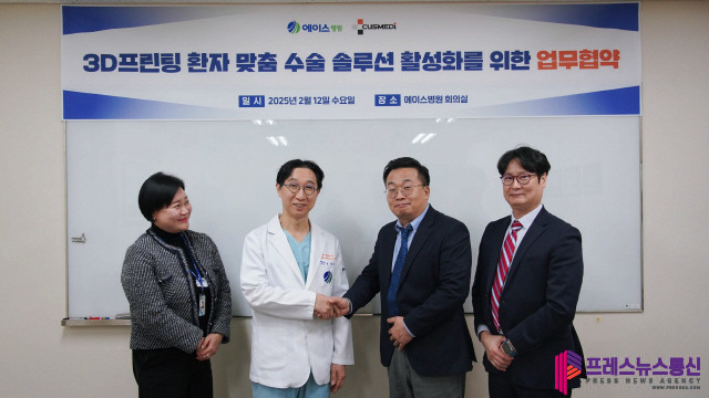 [프레스뉴스] 류현주 기자= 에이스병원이 2025년 2월 12일, ㈜커스메디와 함께 3D 프린팅 기술을 기반으로 한 환자 맞춤형 수술 솔루션 활성화를 위한 업무협약(MOU)을 체결했다.