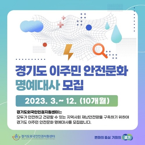 [프레스뉴스] 김대일 기자= 경기도와 경기도 외국인 인권지원센터는 전염병, 수해, 폭염, 화재, 한파 등 재난에 외국인 주민이 대응할 수 있는 지역사회 안전망 구축을 위해 ‘경기도 이주민 안전 문화 명예 대사’를 모집한다.