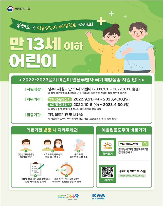 이번 절기의 인플루엔자 국가예방접종 대상은 생후 6개월부터 만 13세 이하 어린이, 임신부, 65세 이상 노인이다.