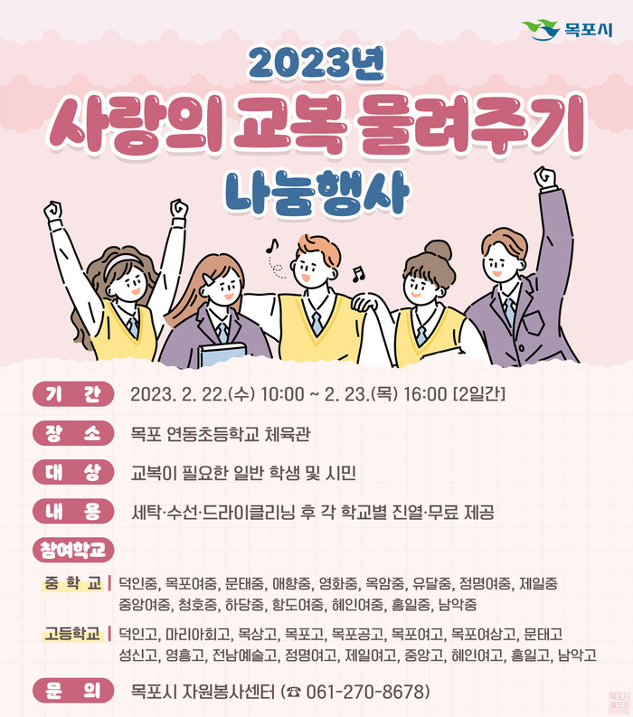 [전남=프레스뉴스] 이광남 기자= 전남 목포시가 오는 22일부터 23일까지 연동초등학교 체육관에서 34개 중·고등학교가 참여한 ‘2023 사랑의 교복 물려주기’ 행사를 실시한다.