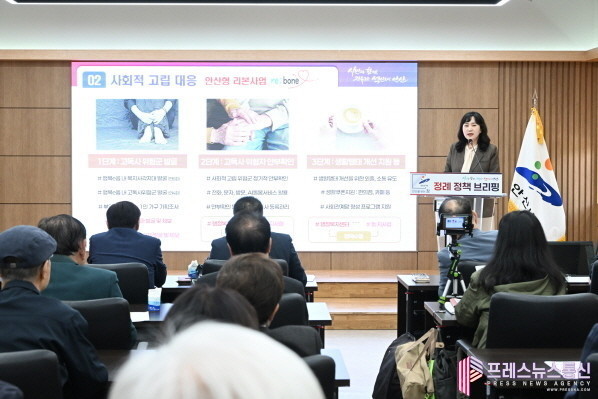 | ▲이경숙 복지국장이 14일 오전 안산시청 제1회의실에서 개최된 4월 정책브리핑에서 '사회적 고립대응 안산형 리본사업'에 대해 설명하고 있다.(사진=안산시) |