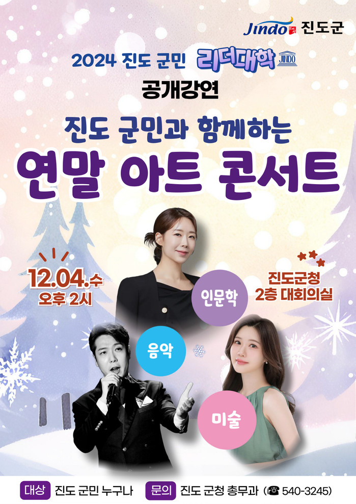 [전남=프레스뉴스] 신상균 기자= 진도군(군수 김희수)은 2024년 ‘진도 군민 리더 대학’ 2회차 공개 강연을 오는 12월 4일 오후 2시에 진도군청 대회의실에서 전 군민을 대상으로 개최한다.