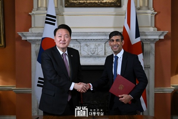 | ▲ 영국을 국빈 방문 중인 윤석열 대통령이 22일(현지시간) 런던 다우닝가 10번지 총리 관저에서 리시 수낵 총리와 ‘다우닝가 합의’에 서명한 뒤 기념촬영을 하고 있다.(사진=대통령실) |