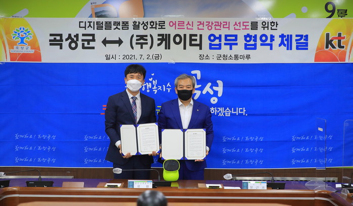 | ▲ 곡성군은 ㈜KT(대표 구현모)와 디지털플랫폼 기반 고령자 건강관리서비스 위한 업무 협약을 체결했다.(사진제공=곡성군) |