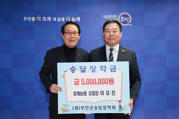 | ▲군수실에서 진행된 청계농협 이요진 조합장 승달장학금 기탁식/무안군 제공 |
