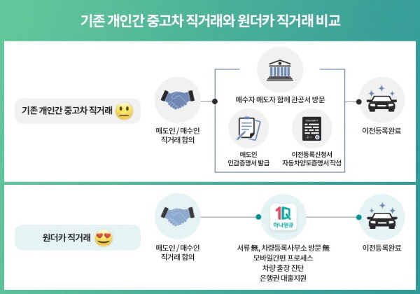 『원더카 직거래』는 동호회 등 중고차 직거래 장터에서 이뤄지는 개인 간 중고차 직거래에 대해 신뢰성과 편의성을 더해주는 플랫폼 서비스로, 은행권 최초로 개인 간 중고차 직거래에 대해 오토금융을 제공한다.