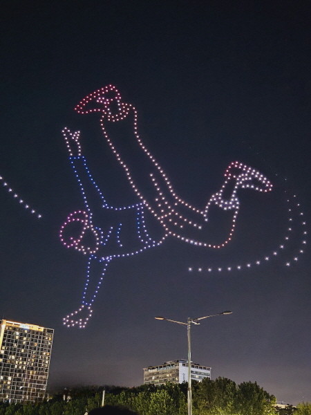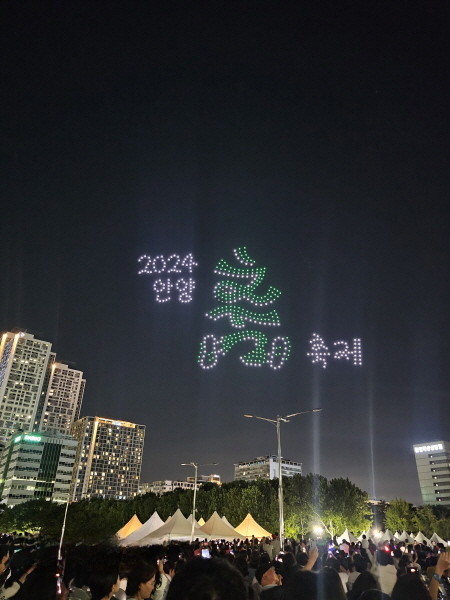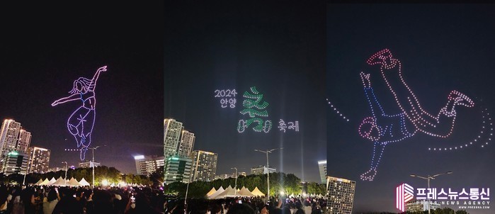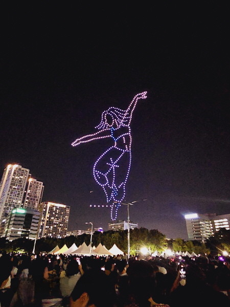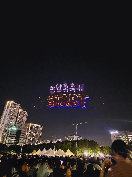 | ▲안양춤축제가 지난 27일 19시 평촌중앙공원과 삼덕공원에서 개막했다. 평촌중앙공원 개막식 마지막 무대로 펼쳐진 가을 밤하늘의 ‘드론라이트쇼’를 시민들이 감상하고 있다.(사진=안양시) |