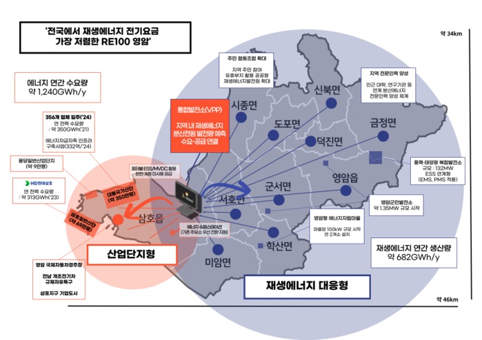 영암군의 경우 지역 내에 대불국가산단과 삼호일반산단(HD현대삼호) 등 연간 약 1TWh/y 규모의 수요처가 존재한다. 2022년 기준 연간 재생에너지 생산량도 682GWh/y에 달해 재생에너지 자립률이 약 55%에 육박하는 등 발전량 규모도 상당하다. 지역 내 수요와 공급이 모두 존재해 분산에너지 특화지역에 최적의 조건을 가지고 있다.