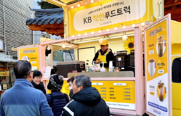 [프레스뉴스] 류현주 기자= KB금융그룹(회장 양종희)은 16일 서울시 종로구 통인시장에서 전통시장을 활성화하고 소상공인의 성장을 응원하고자 ‘KB착한푸드트럭’과 함께 180여 명의 소상공인에게 따뜻한 차와 간식을 제공했다.