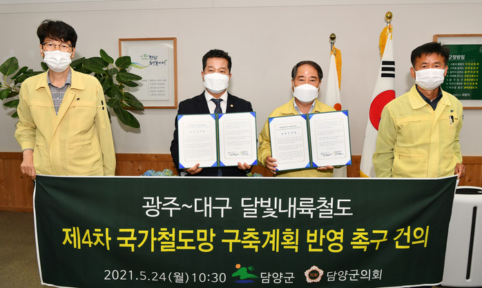 담양군과 군의회는 이날 건의문을 통해 “지난 4월 제4차 국가철도망 구축계획(안)에 ‘달빛내륙철도 건설사업’이 제외된 것에 대해 지역민의 실망감은 이루 말 할 수 없다”며 “문재인 대통령의 영호남 상생공약이자 국정 100대 과제인 만큼 지역민의 열망을 담아 중앙정부에 국가철도망 구축계획에 반영을 촉구한다”고 밝혔다.