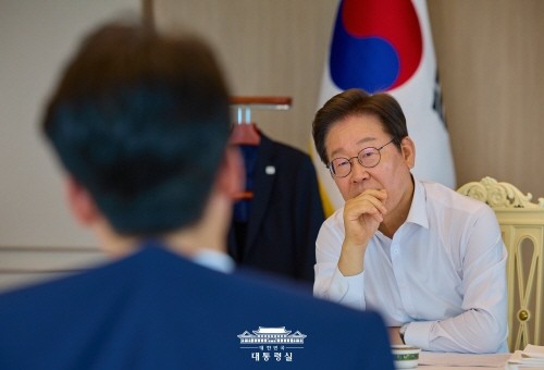 ▲이재명 대통령이 28일 서울 용산 대통령실 청사에서 열린 오찬 주례보고회동에서 김민석 국무총리와 대화하고 있다.(사진= 대통령실) |