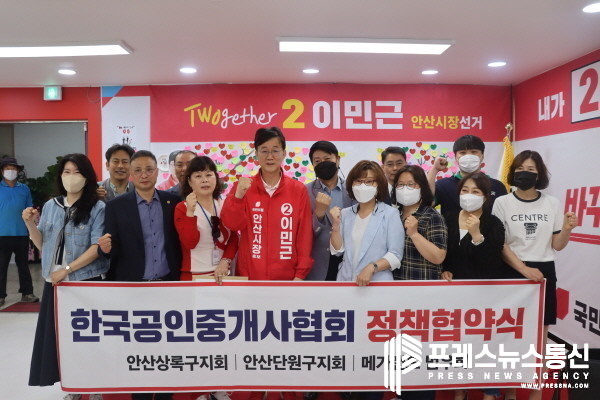[프레스뉴스] 김대일 기자= 한국공인중개사협회 경기남부지부 상록구지회(지회장 : 황규호), 단원구지회(지회장 : 윤인숙), 메가랜드 법우회 회장(회장 : 정성기) 등은 26일 「민심캠프」를 방문, 이민근 국민의힘 안산시장 후보에 정책건의서를 제출하고 협약식을 맺었다.