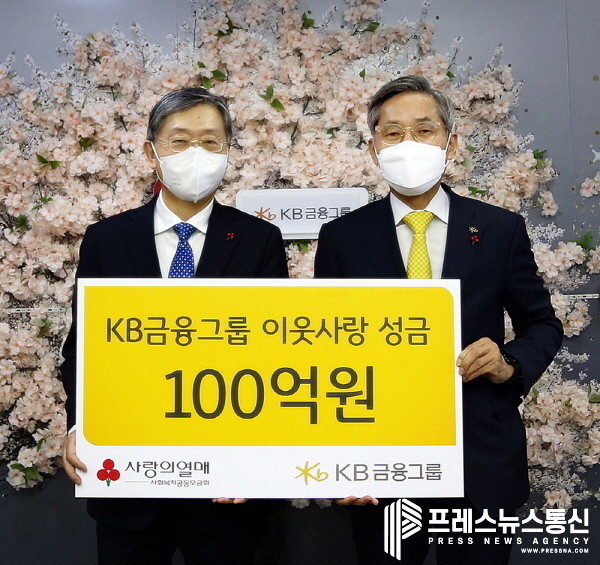 KB금융그룹(회장 윤종규)은 21일 서울시 중구 정동에 위치한 ‘사랑의열매 회관’에서 KB금융 윤종규 회장과 사회복지공동모금회 조흥식 회장이 참석한 가운데 ‘희망 2022 나눔캠페인’에서 이웃사랑 성금 100억원을 ‘사랑의열매’ 측에 기부하는 전달식을 가졌다.