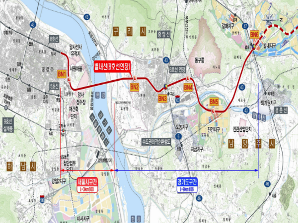 도시철도 8호선 연장(별내선)구간은 현재 운행 중인 지하철 8호선 종점역인 암사역(강동구 암사동)을 시작으로 한강 하부를 통과하여 구리시 구간을 지나 남양주시 별내읍까지 12.906㎞에 구리역(경의중앙선), 별내역(경춘선) 등 환승정거장 2개소를 포함한 정거장 6개소가 설치되며, 총 사업비는 1조 3,403억 원이다.