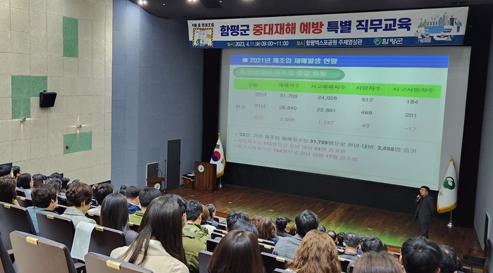 11일 군에 따르면 군청 공직자를 대상으로 이날 오전 함평엑스포공원 주제영상관에서 중대재해 예방 특별 직무교육을 실시했다.