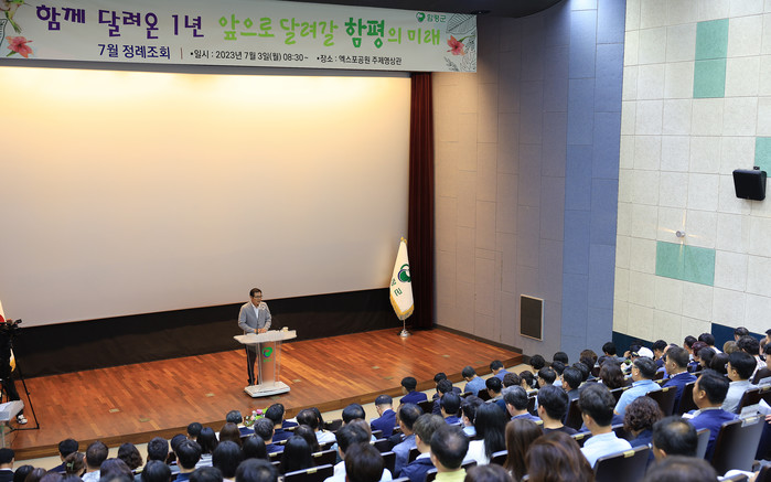 함평군은 3일 “7월 중 정례조회가 이날 오전 함평엑스포공원 주제영상관에서 공직자 등 300여 명이 참석한 가운데 열렸다”고 밝혔다.