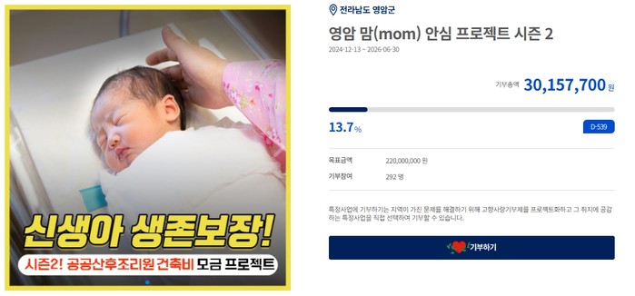 여기에 더해 2023년부터 ‘영암맘 안심프로젝트’ ‘고향사랑 소아청소년과 운영’ 등 지정기부를 시행해 목표금액을 조기달성하고, 민간플랫폼 ‘위기브’를 활용한 모금 진행으로 지역사회 안팎의 관심을 끌었다.