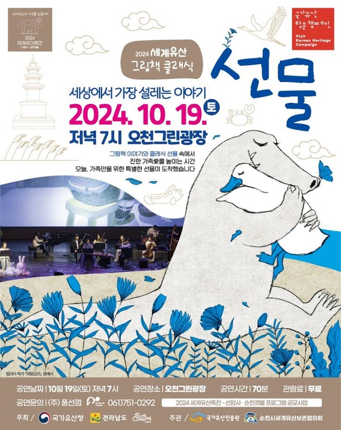 그림책 클래식은 ‘선물, 세상에서 가장 설레는 이야기’라는 주제로 세계유산을 담은 그림책 이야기와 클래식 공연이 어우러진 무대이다. 그림책 「파랑 오리」, 「북극곰 아들」, 「사실은 말이야」에 담긴 아름다운 이야기를 전문 성우의 낭독을 통해 가슴 뭉클한 감동을 선사할 예정이다. 또한 선암사와 순천갯벌 이야기를 모래로 그려낸 창작 샌드아트 퍼포먼스와 수준 높은 클래식 앙상블의 선율이 여유로운 사색의 가을밤으로 인도한다. 특히 이번 공연은 시민이 만드는 축제라는 모토에 따라 시민 공모로 선발된 예술단체가 직접 기획하고 준비한 세계유산 향유 프로그램이다.