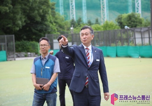 | ▲지난 6월 허숭 안산도시공사 사장이 관계자와 썰매장을 둘러보고 있다. |
