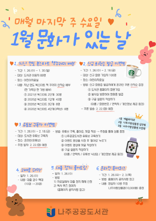[전남=프레스뉴스] 강래성 기자= 나주공공도서관(관장 김도진)은 학생 및 지역민의 문화 향유의 기회를 확대하고 도서관 이용을 활성화하기 위해 ‘문화가 있는 날’을 맞아 1월 26일부터 2월 18일까지 다양한 행사를 운영한다.