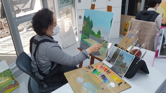 | ▲화순군립석봉미술관 미술교실 1기 수강생이 유화 기초 습득을 위해 모작을 하는 모습(사진제공=화순군) |