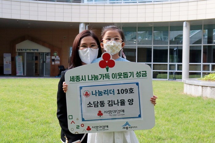 주인공은 김현미 세종시의회 의원의 자녀 김나율 양으로 세종사회복지공동모금회는 지난 23일 소담동행정복지센터에서 나눔리더 가입식을 가졌다.