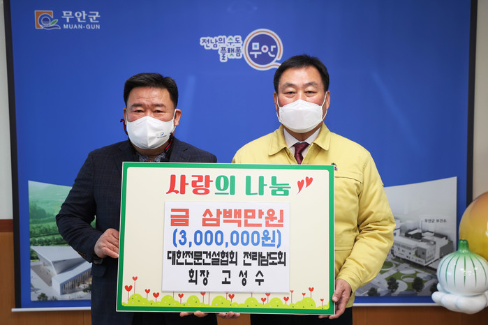 [전남=프레스뉴스] 강래성 기자= 무안군은 지난 13일 대한전문건설협회 전라남도회 고성수 회장으로부터 불우이웃을 위한 성금 300만원을 기탁받았다고 밝혔다.