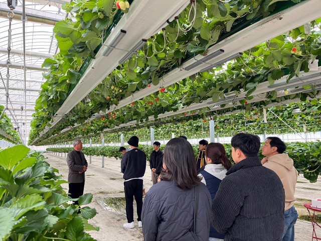 | ▲딸기 ICT 스마트팜시설(경주시) 사례조사 모습.(사진제공=화순군) |