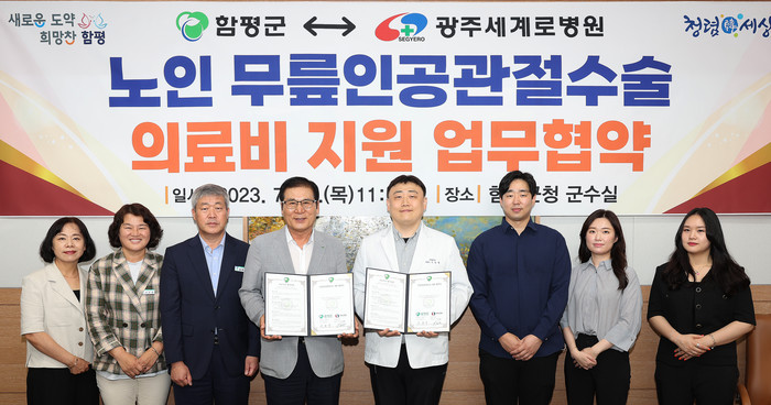 전남 함평군은 13일 “어르신들의 무릎인공관절 수술 진료비 지원을 위해 광주 세계로 병원과 업무 협약을 체결했다”고 밝혔다.