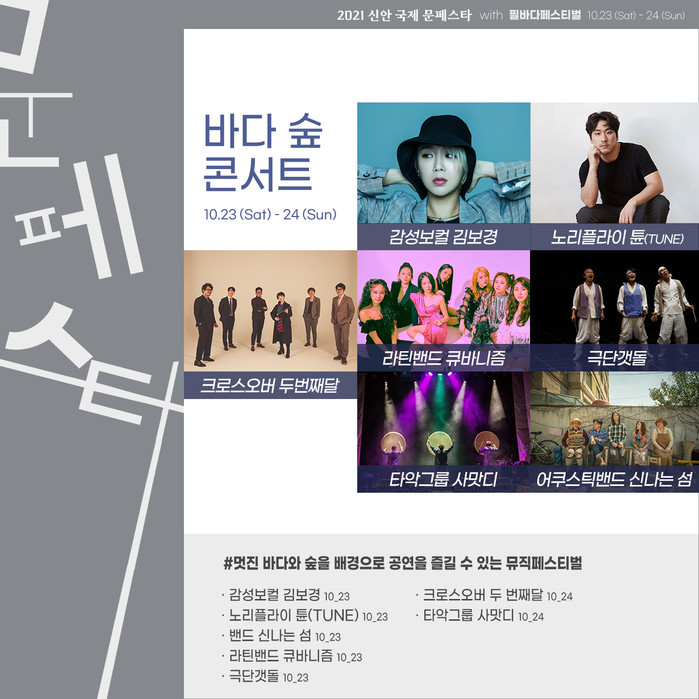 공연 프로그램은 라틴밴드 큐바니즘, 노리플라이 정욱재 TUNE, 김보경&네온밴드, 크로스오버 두 번째달&소리꾼 오단해, 갯돌, 타악그룹 사맛디 등 국내 유명 아티스트가 참여한 라이브 공연을 선보일 에정이다.
