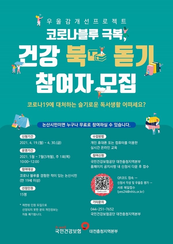 [프레스뉴스] 최정현 기자= 국민건강보험공단 대전충청지역본부(본부장 성백길)는 코로나 19로 몸과 마음이 지친 지역민을 대상으로 19일부터 오는 30일까지 ‘코로나블루 극복, 건강 북(Book)돋기’ 참여자를 모집한다.