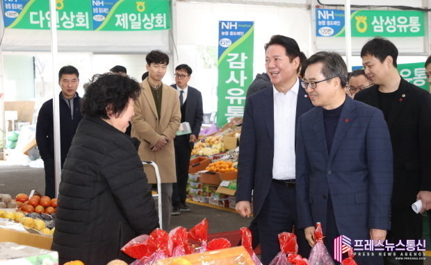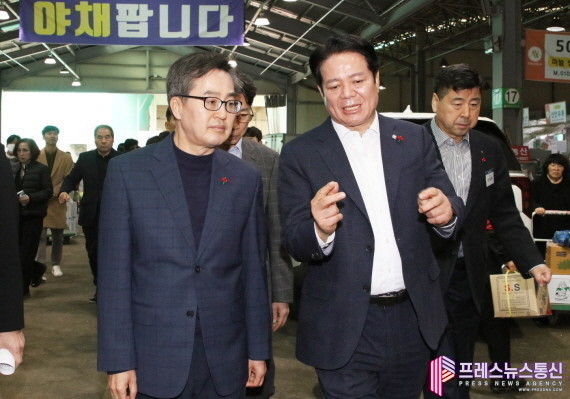 | ▲김동연 경기도지사(왼쪽)와 최대호 안양시장(오른쪽)이 지난 21일 오전 농수산물도매시장을 둘러보고 있다.(사진=안양시) |