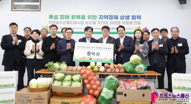24일 안양시에 따르면, 지난 21일 오전 10시 안양농수산물도매시장 관리동 3층에서 경기사회복지공동모금회 주관으로 경기도, NH농협은행 경기본부, 안양시가 참여한 가운데 ‘폭설 피해 회복을 위한 지역경제 상생 협력’ 행사를 개최했다.