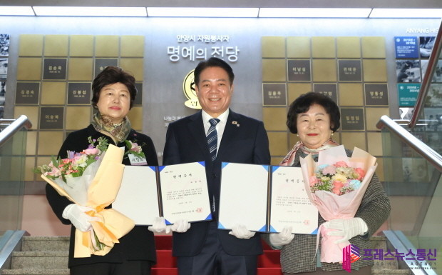 | ▲(왼쪽부터) 서정희 봉사자, 최대호 안양시장, 임정임 봉사자(사진=안양시) |