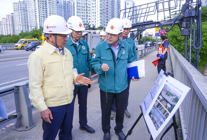 강기정 시장을 포함한 광주시 민관합동점검반은 지난 20일 오후 광산구 하남대교에서 ‘2025년 집중안전점검’의 하나로, 여름철 풍수해 대비 안전점검을 진행했다.