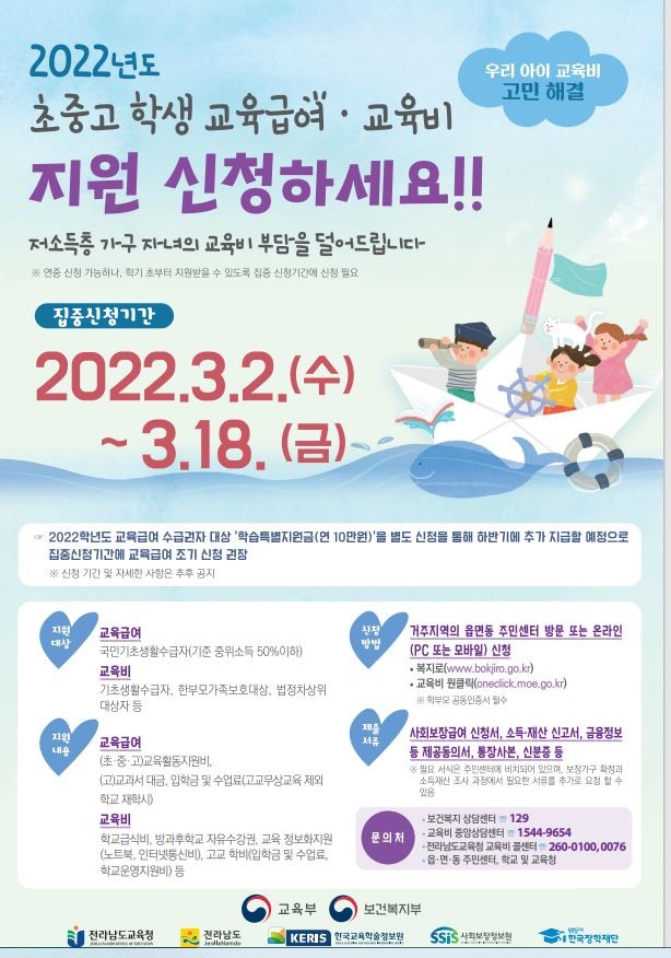 전라남도교육청은 3월 2일(수)부터 3월 18일(금)까지 ‘초·중·고 학생 교육급여 및 교육비(이하 교육비) 지원’ 집중 신청 기간을 운영한다고 24일(목) 밝혔다.