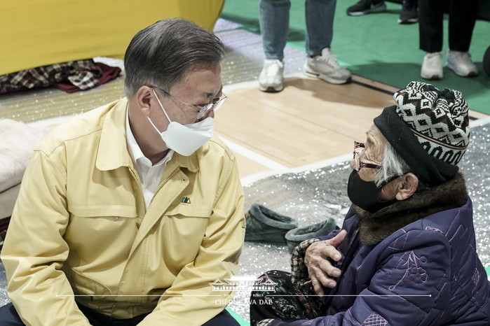 문 대통령은 피해 어르신들을 위해 파견된 심리 지원 경찰에게 "정신적으로 입은 충격들도 상당할 텐데, 그런 부분을 많이 지원해 주시기 바란다"며 "2019년도 강원 산불 때의 경험이 있으니 그 경험들을 살려서 그때보다 더 잘 대응하도록 해 주시면 좋겠다"고 말했다.