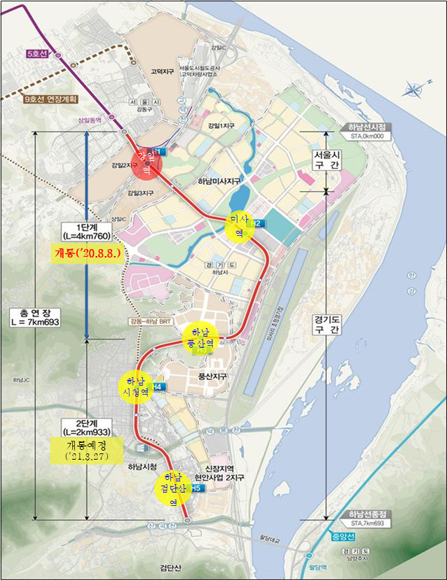 지난 2015년 첫 삽을 뜬 이후 1단계 구간인 상일동역~하남풍산역 4.7㎞의 운행을 지난해 8월부터 시작했으며, 이번 2단계 구간인 하남풍산역~하남검단산역 3㎞를 완공해 전 구간 완전 개통시대를 맞게 됐다.