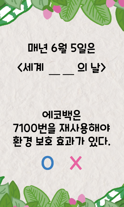 세계 환경의 날에 대한 관심을 높이고 금년도 주제인 ‘생태계 복원’, 우리가 환경을 위한 물품으로 알고 있는 에코백 등의 재사용, 재활용의 실천에 대해 서울대공원 SNS(페이스북, 인스타그램) 퀴즈 학습을 실시한다.